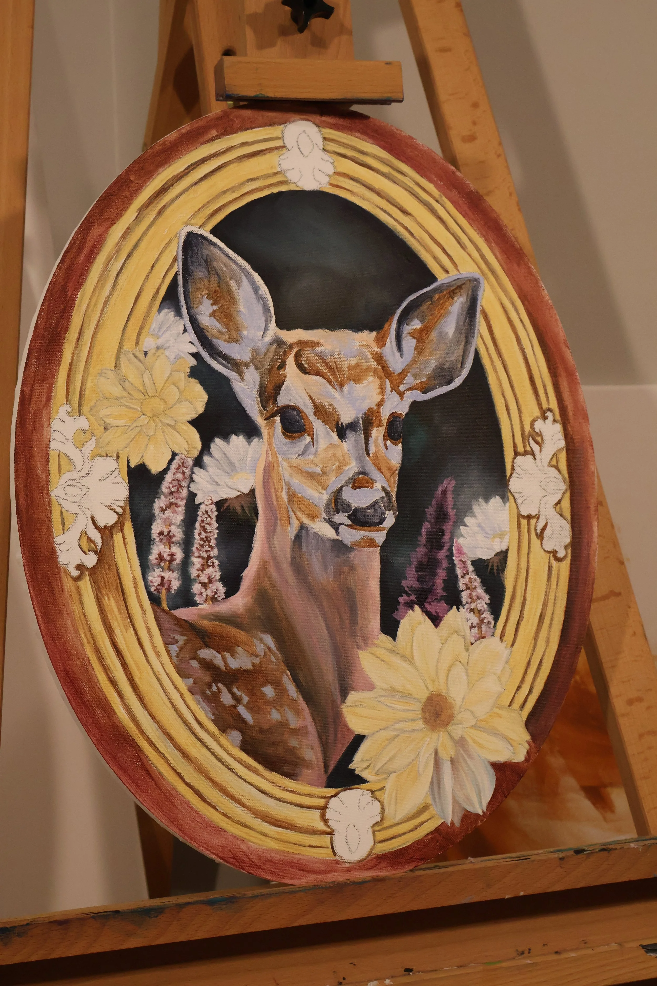 Flora & Fawn was the first piece in this collection, and I knew it had to set the tone for everything that followed. No pressure, right? It took time to land on the main subject, but when the idea of a fawn came to me, it felt right. Fawns symbolize new beginnings and that’s exactly what this piece came to represent for me.