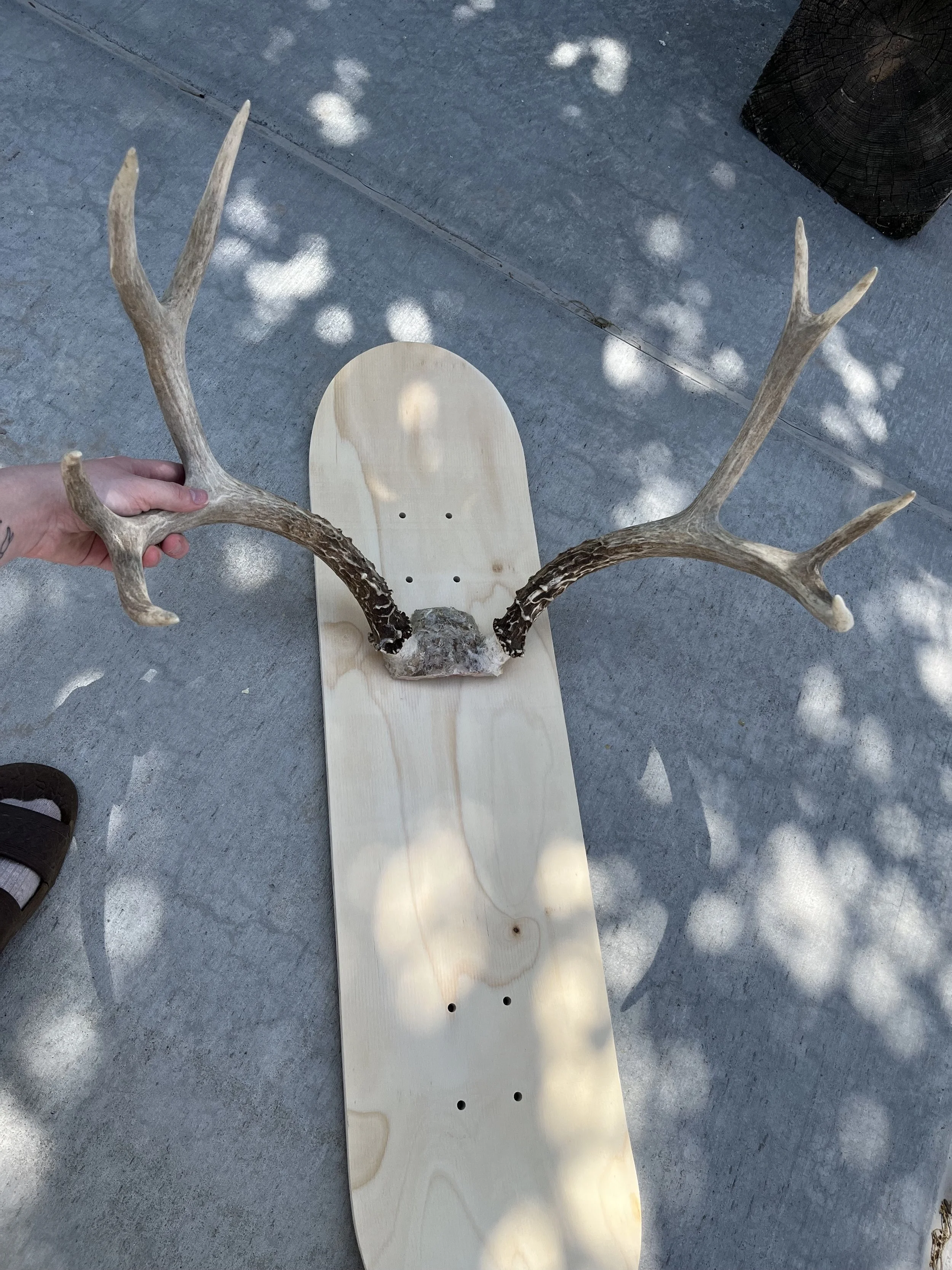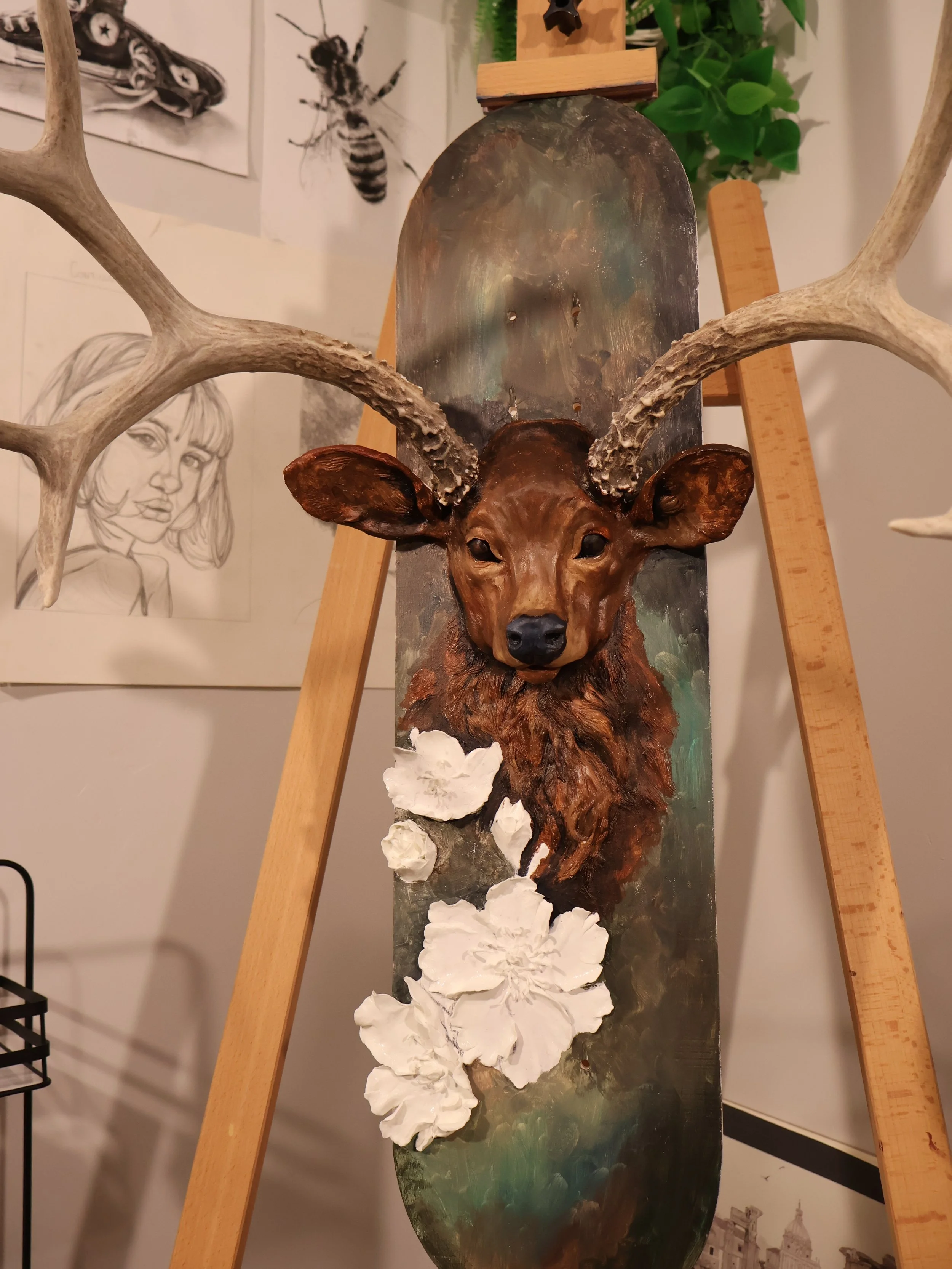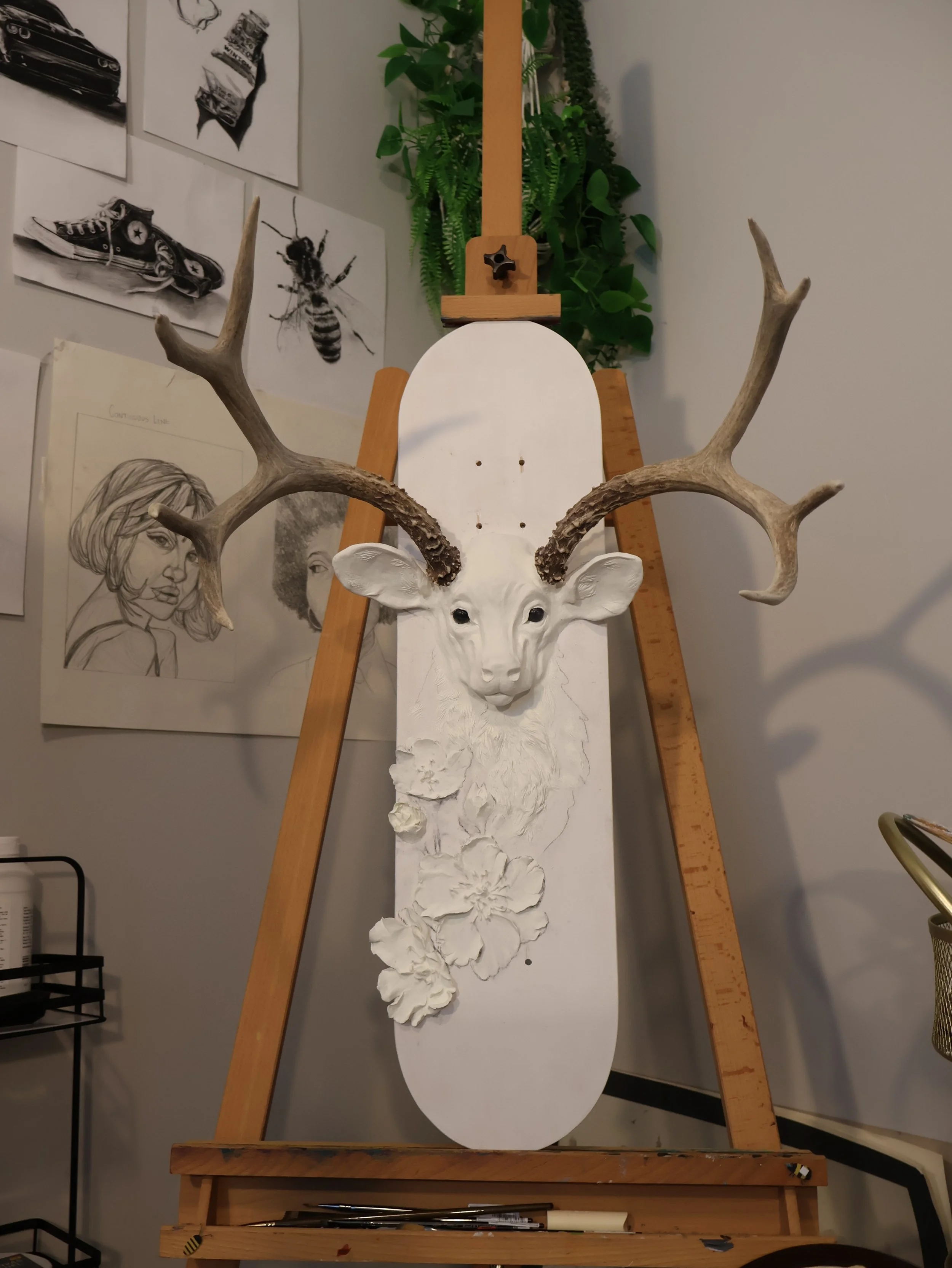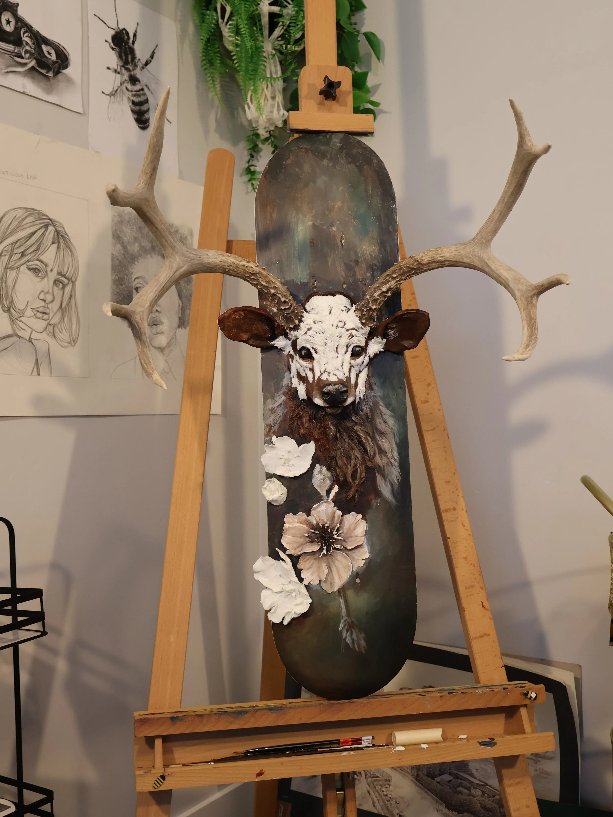 Before any paint touched the surface, I had to figure out how to physically build the piece. The antlers and skull plate needed to be mounted securely into the board, a challenge that required some problem solving. Finding a way to anchor them into the skateboard while keeping everything balanced and visually cohesive became its own creative puzzle. Once the armature was stable, I moved on to the sculptural elements.